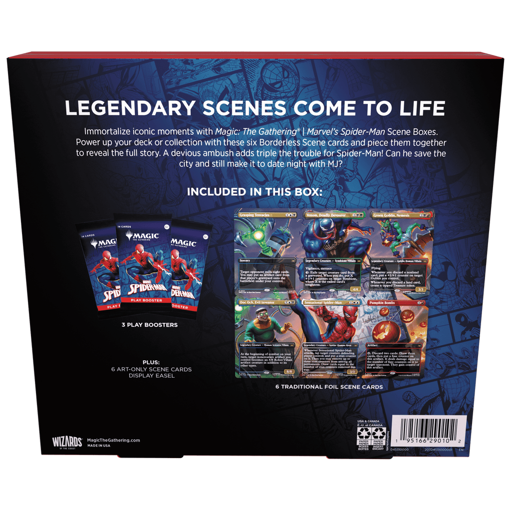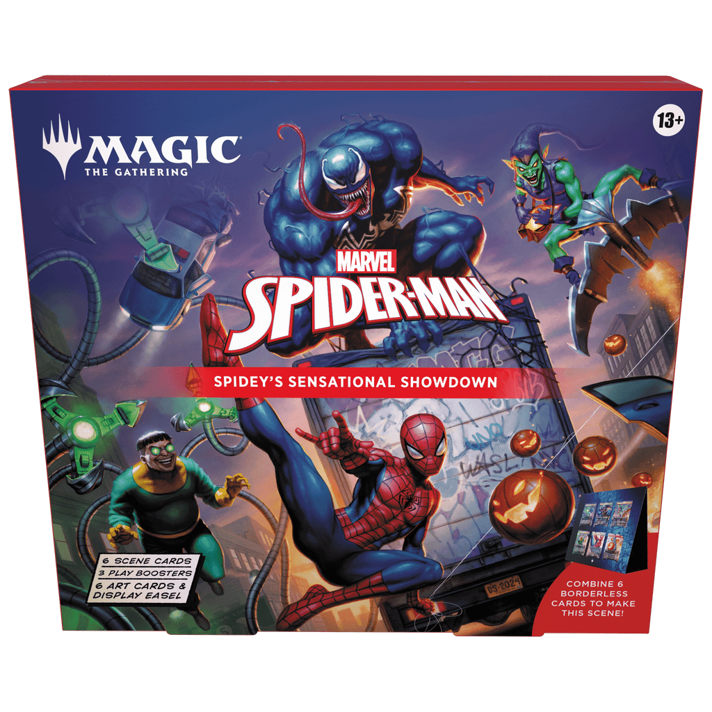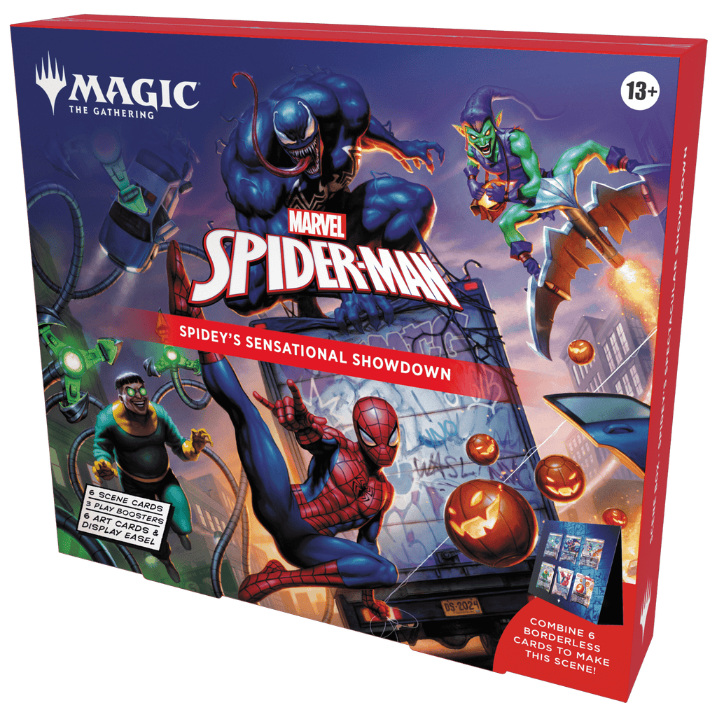 The Marvel’s Spider-Man Scene Box is more than just a collection—it’s a display-worthy tribute to the web-slinger’s heroic struggles. Inside, you’ll find six Borderless Scene cards in both foil and art-only versions, which combine to create an epic panoramic moment of Spider-Man facing a dangerous ambush. With three Play Boosters included, you’ll also get the thrill of cracking packs loaded with rares, foils, and showcase treatments. To top it all off, the set includes a display easel, so you can proudly show off the full Spider-Verse scene in your collection. Perfect for collectors, display enthusiasts, and anyone who wants to immortalize Spider-Man’s story in Magic form!