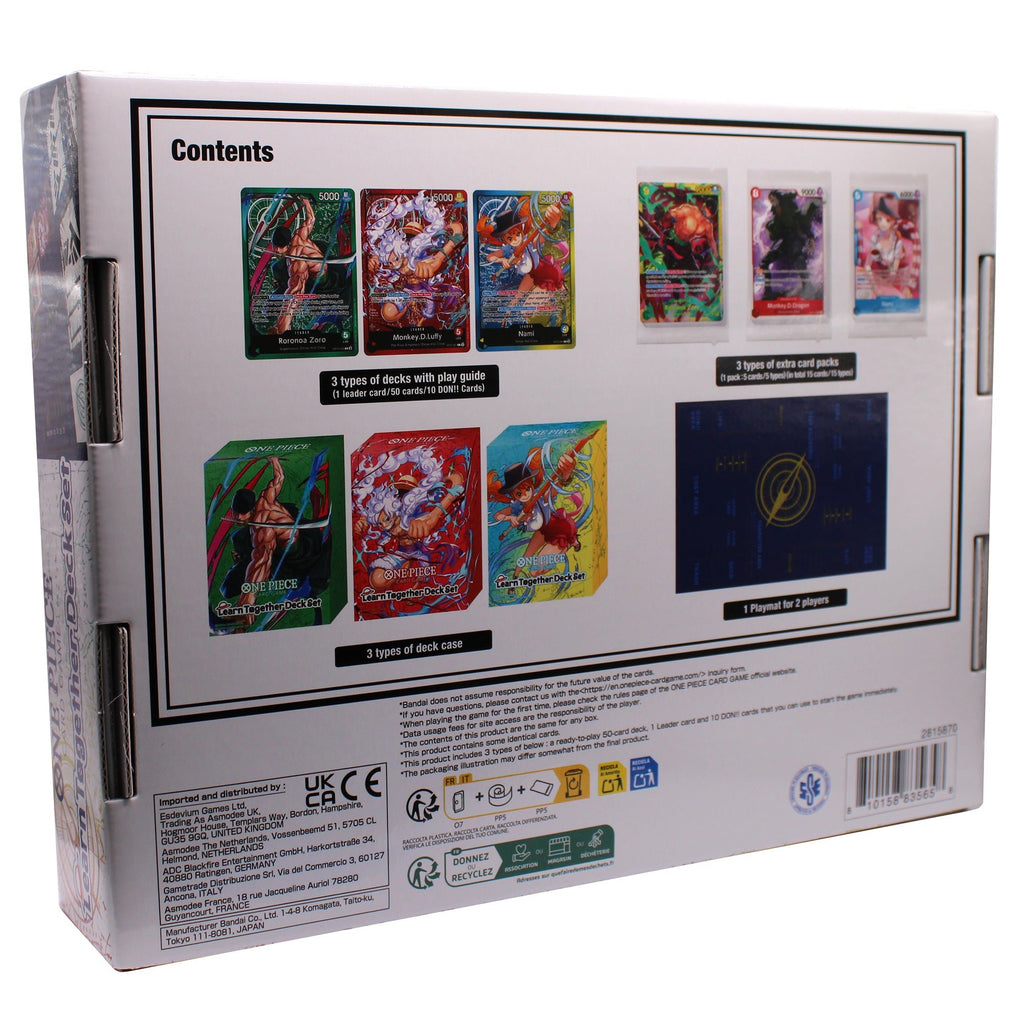 Set sail on your first One Piece card game adventure with friends and family! The One Piece TCG: Learn Together Deck Set is the perfect entry point for new players, featuring three pre-constructed decks starring Luffy, Zoro, and Nami—each with its own guidebook to help you master the game, step-by-step.